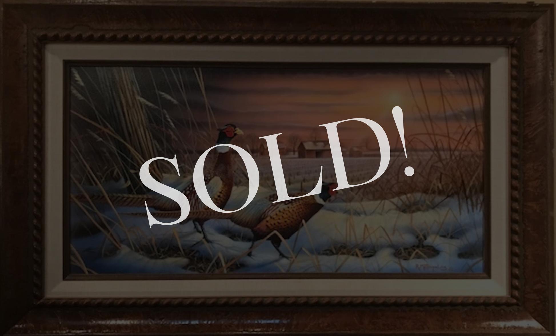 This original acrylic painting depicts two Ring-Necked Pheasants walking a winter fence line.