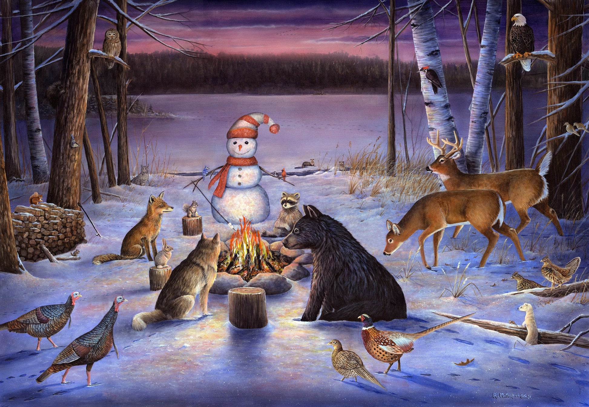 Is part of a limited edition of 100 Giclée paper and 100 Giclée canvas prints. It depicts a whimsical winter scene where woodland animals gather around a campfire beside a snowman at dusk.