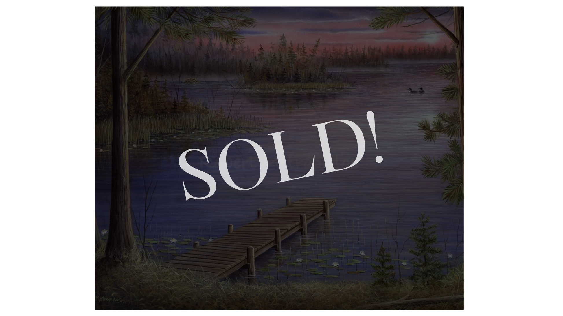 This original acrylic depicts a pier reaching out to calm waters with colors of an evening sunset.