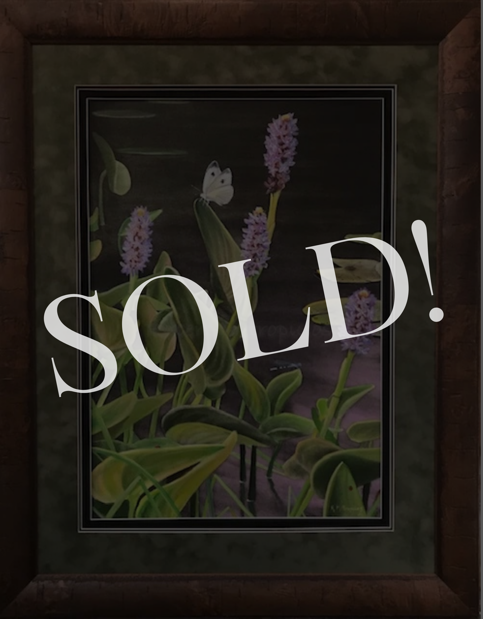 This original acrylic/charcoal depicts a Pickerelweed with a cabbage moth.